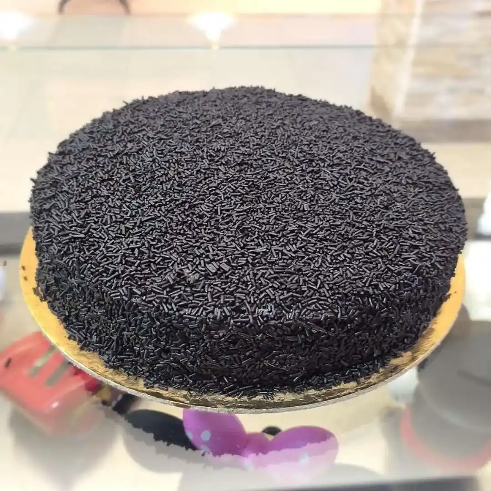 Massa de chocolate, recheado e coberto com chocolate de cacau e leite condensado e decorado com granulado de chocolate de cacau.